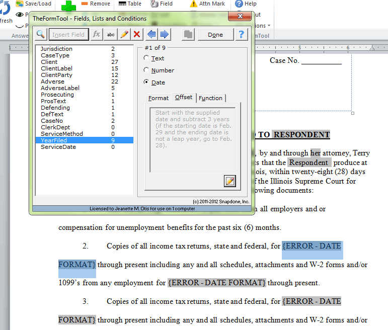 Form field says take that answer and subtract 3 years (through the Field – Date Offset option). So, when I fill the form, it gives me an Error – Date Format. I formatted the field to show yyyy.